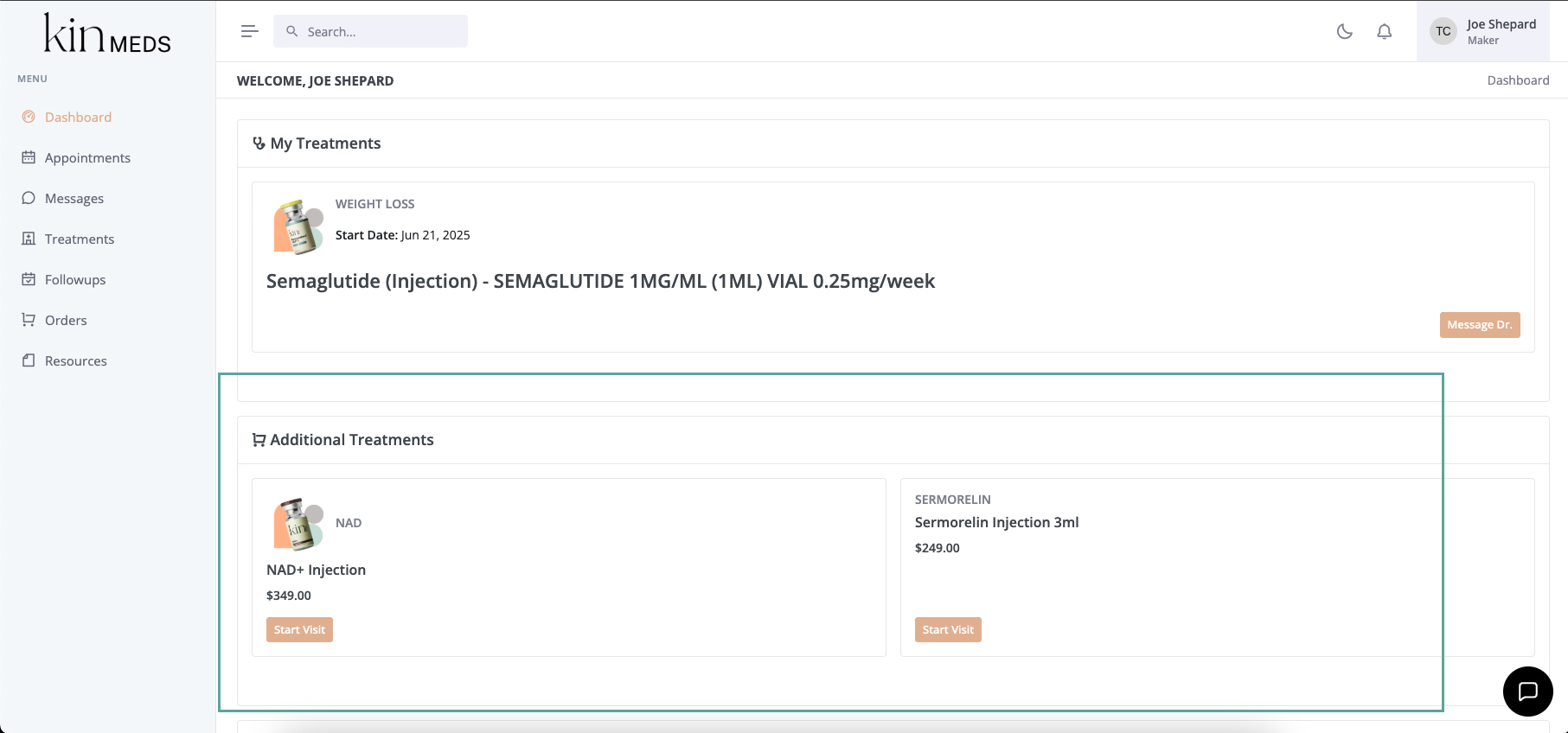 As an example, in the Kin Meds portal (see included screenshot), a patient currently on a weight loss plan is shown options to initiate consultations for NAD+ and Sermorelin.